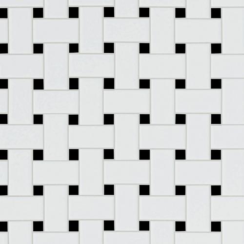 Satin white and glossy black porcelain mosaic floor and wall tile.